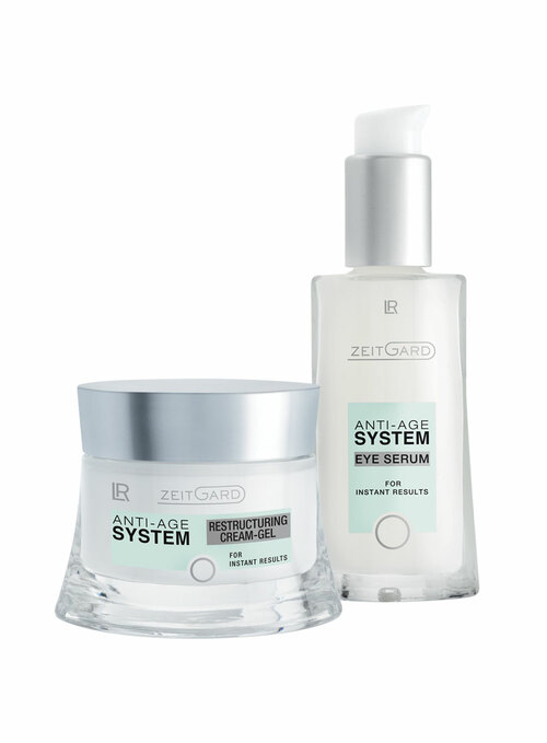 Die Anti-Age Produkte, das ZEITGARD Anti-Age System Eye Serum und die ZEITGARD Anti-Age System Restructuring Cream-Gel, umfassen das ZEITGARD Anti-Age System Restructuring-Set.